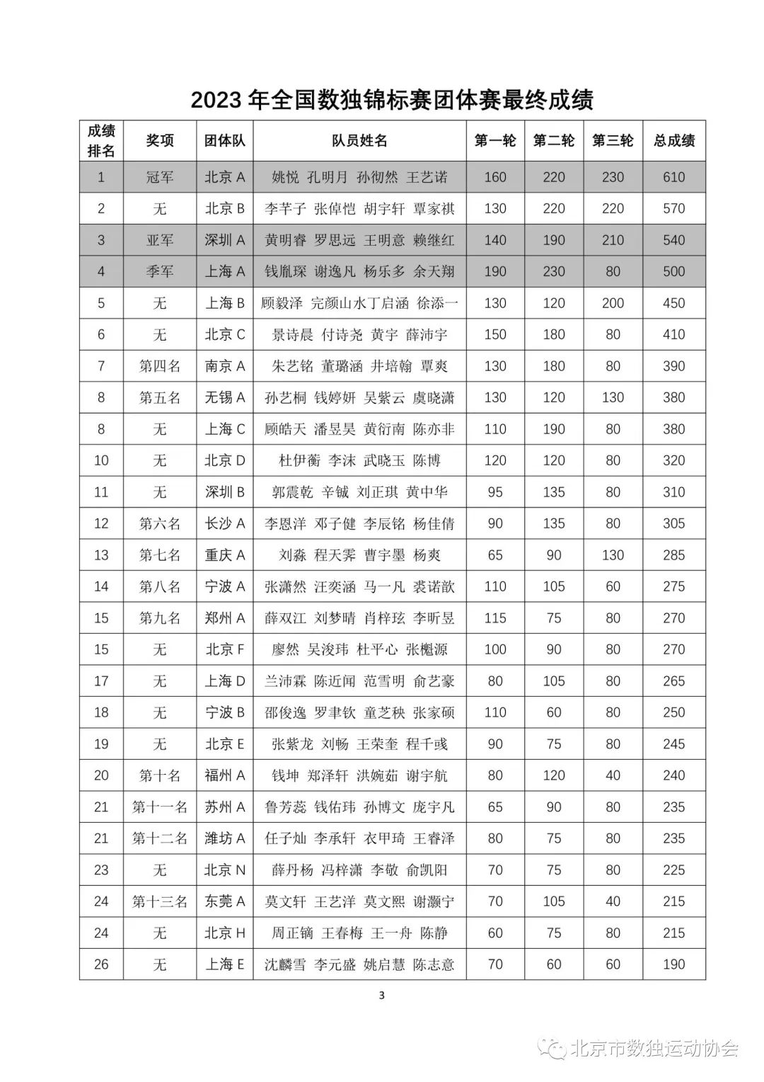 锦标赛于10月5日结束,先将成绩公布如下: